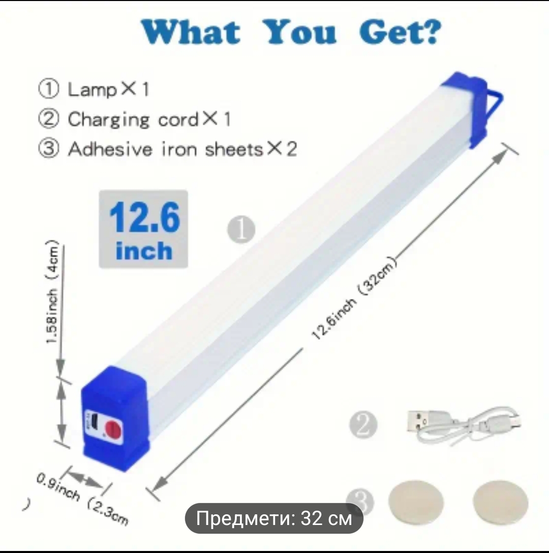 LED лампа аккумуляторная, час роботи до 12 годин, довжина лампи 32 см.